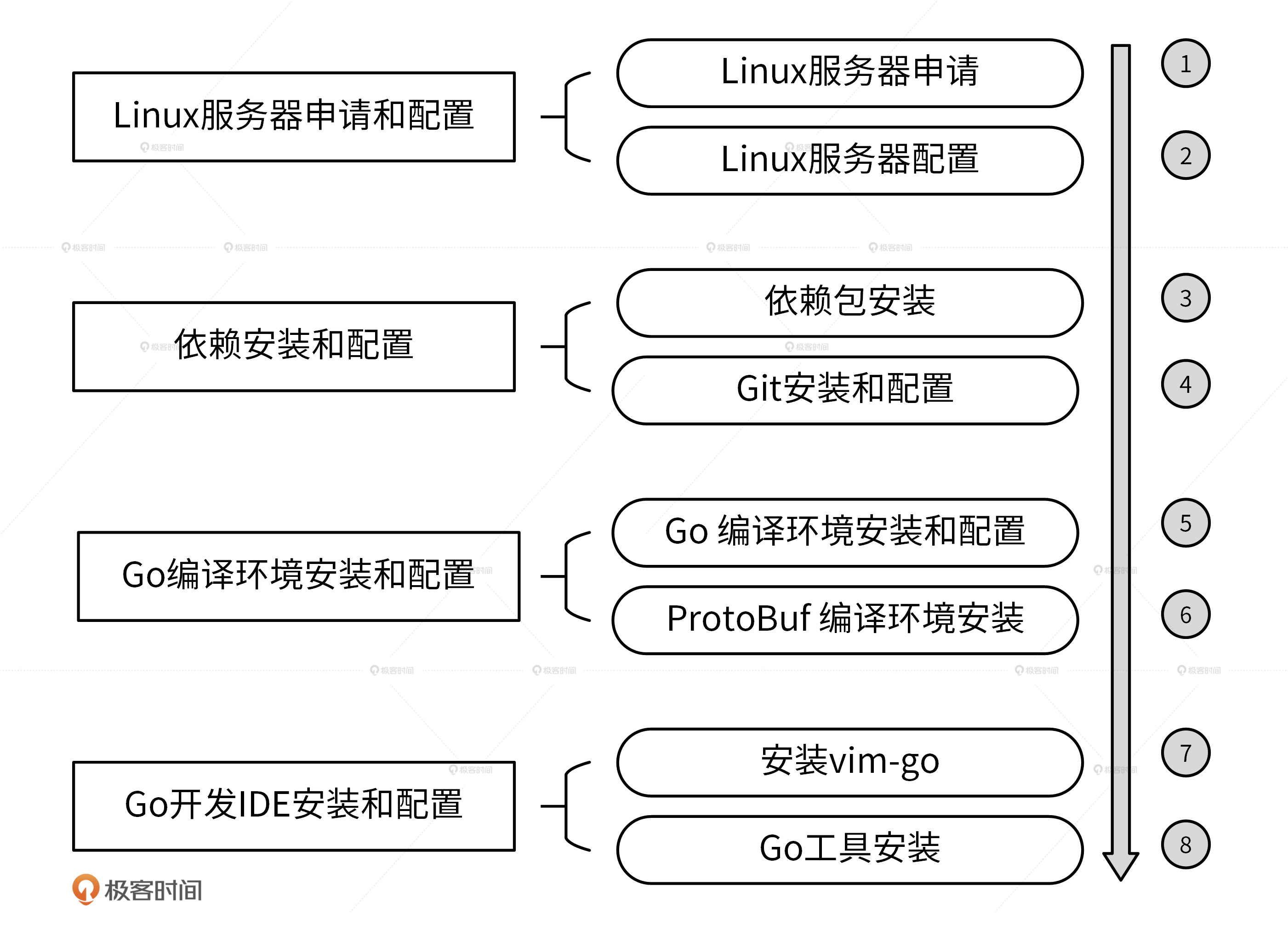 这一讲,我们一起安装和配置了一个 Go 开发环境,为了方便你回顾,我将安装和配置过程绘制成了一个流程图,如下所示。