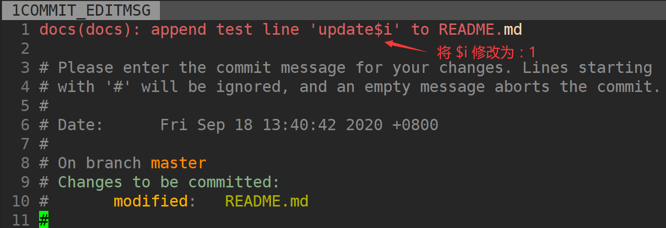 89651d4 docs(doc): add README.md可以看到,最近一次的 Commit Message 是 docs(docs): append test line 'update$i' to README.md,其中 update$i 正常应该是 update1。