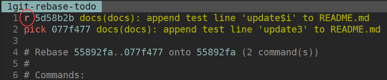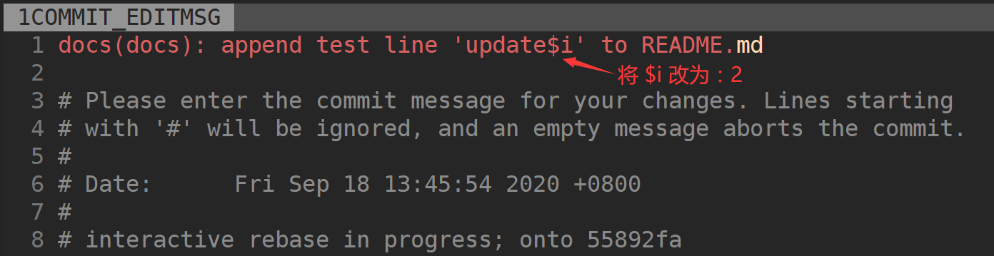 89651d4 docs(doc): add README.md可以看到倒数第 3 次提交的 Commit Message 是:docs(docs): append test line 'update$i' to README.md,其中 update$i 正常应该是 update2。