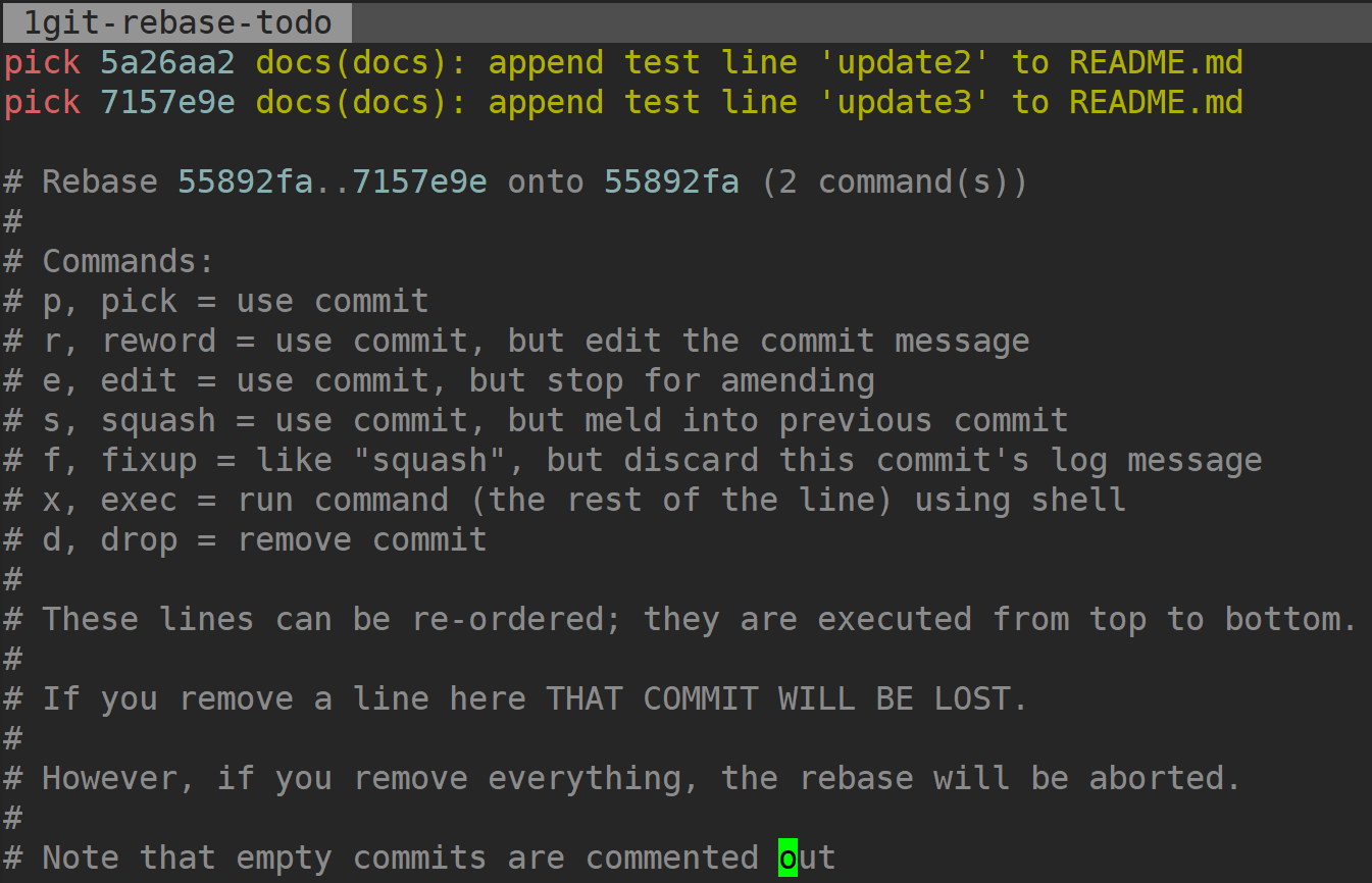 #开头的行是 git 的注释,我们可以忽略掉,在 rebase 后,这些行将会消失掉。修改完成后执行:wq 保存,就完成了合并提交操作。