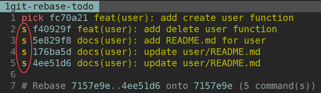 git rebase -i <commid ID>这里的 一定要是需要合并 commit 中最旧 commit 的父 commit ID。- 我们希望将 feature/user 分支的 5 个 commit 合并到一个 commit,在 git rebase 时,需要保证其中最新的一个 commit 是 pick 状态,这样我们才可以将其他 4 个 commit 合并进去。