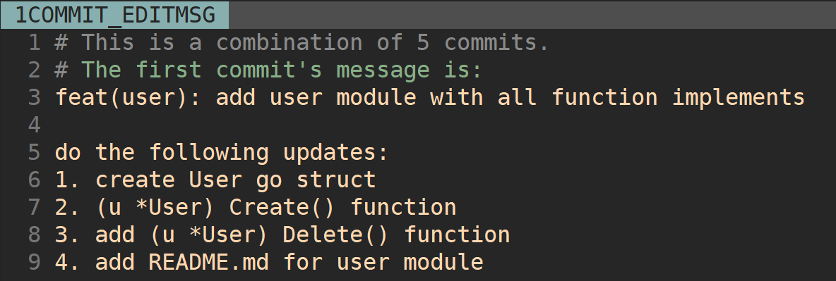 $ git commit -am "feat(user): add user resource"需要说明一点:除了 commit 实在太多的时候,一般情况下我不建议用这种方法,有点粗暴,而且之前提交的 Commit Message 都要重新整理一遍。