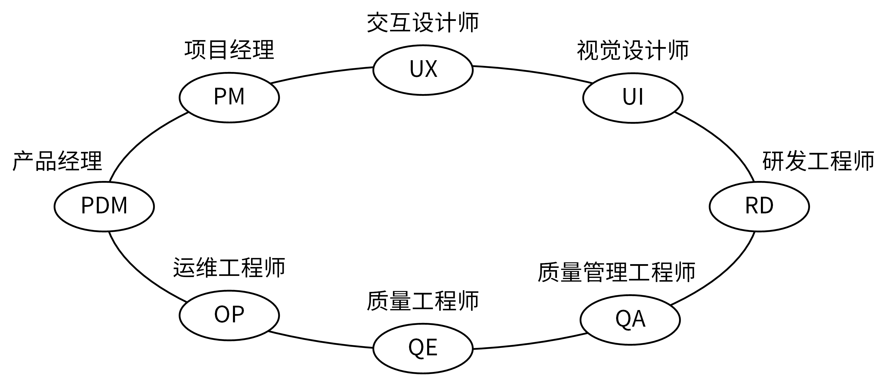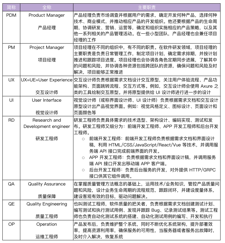 到这里,业界相对标准的这套研发流程,我们就学完了。在学习过程中,你肯定也发现了,整个研发流程会涉及很多角色,不同角色参与不同的阶段,负责不同的任务。这里我再给你额外扩展一个点,就是这些核心角色和分工是啥样的。
