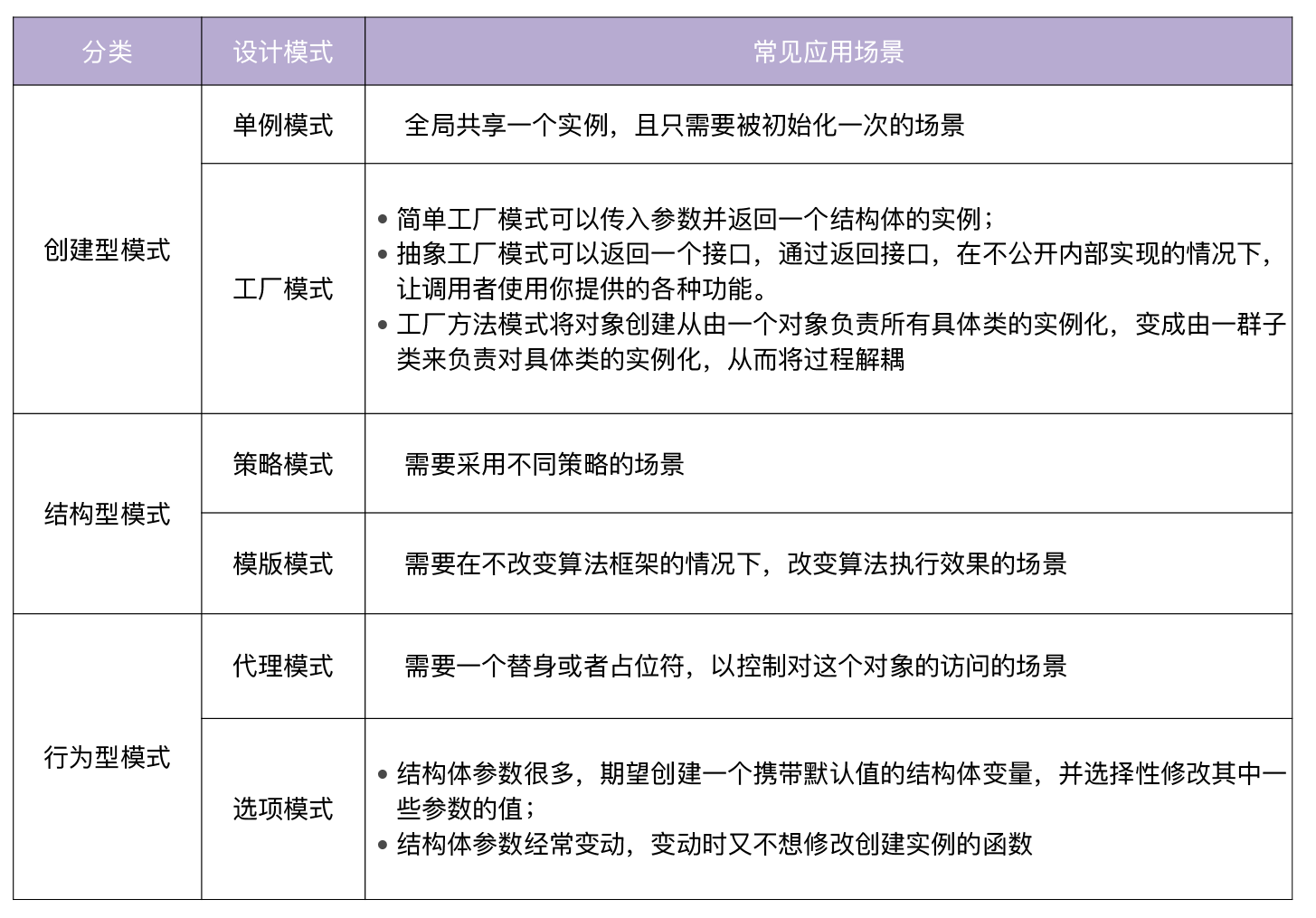 这一讲,我介绍了Go项目开发中6种常用的设计模式。每种设计模式解决某一类场景,我给你总结成了一张表格,你可以根据自己的需要进行选择。
