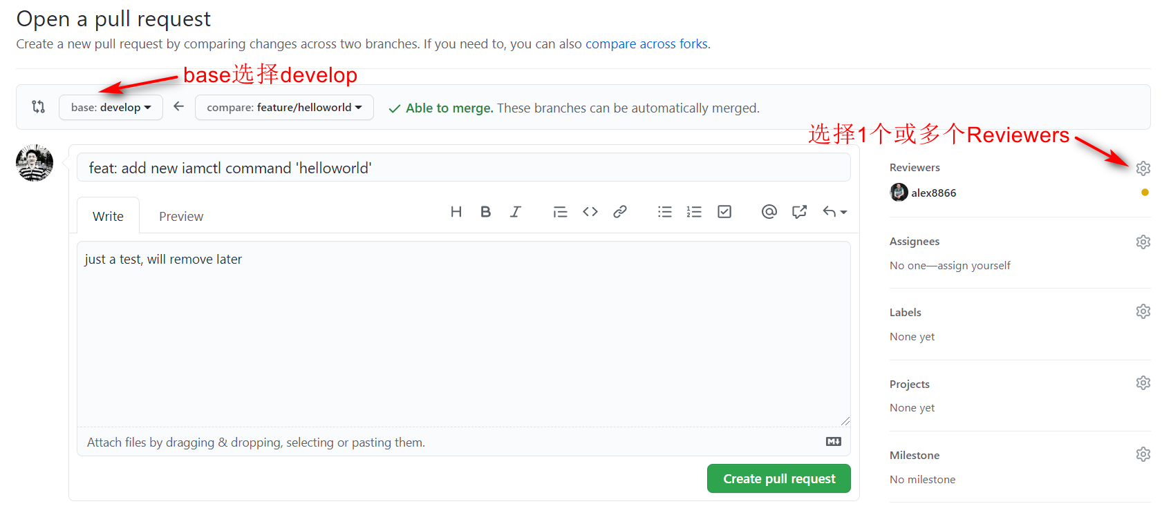登陆GitHub,基于feature/helloworld创建pull request,并指定Reviewers进行code review。具体操作如下图: