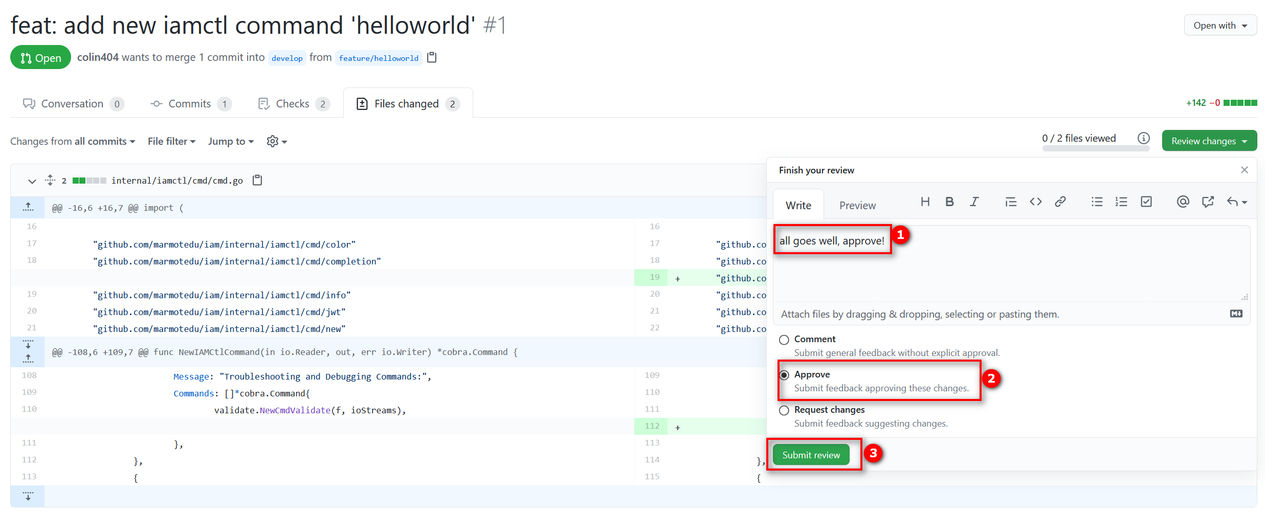Reviewer通过review github diff后的内容,并结合CI流程是否通过添加评论,并选择Comment(仅评论)、Approve(通过)、Request Changes(不通过,需要修改),如下图所示: