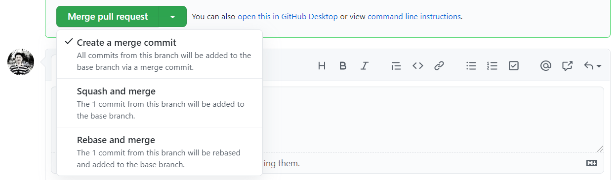 使用Create a merge commit的方式,将pull request合并到develop分支,如下图所示: