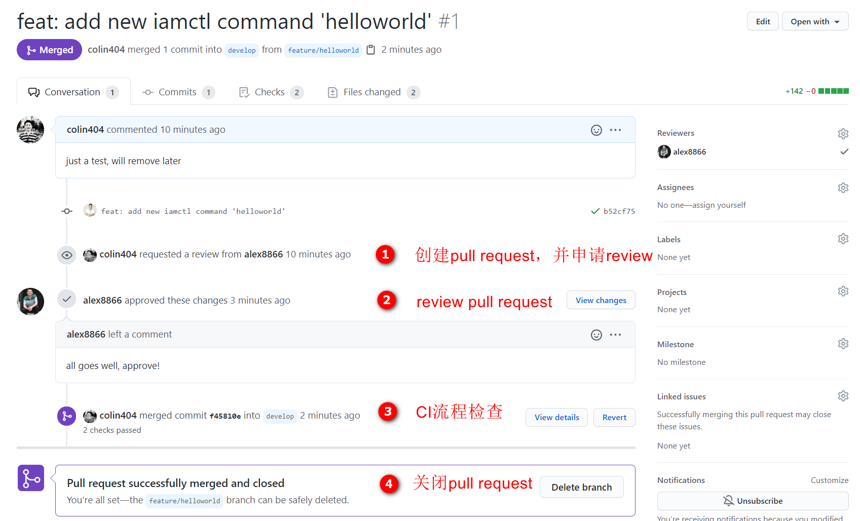 如果review不通过,feature开发者可以直接在feature/helloworld分支修正代码,并push到远端的feature/helloworld分支,然后通知reviewers再次review。因为有push事件发生,所以会触发GitHub Actions CI流水线。