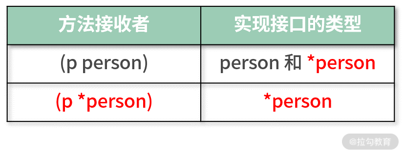 我用如下表格为你总结这两种接收者类型的接口实现规则: