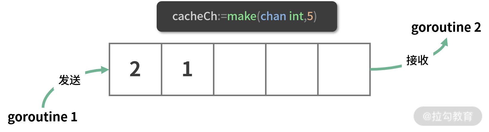 - 发送操作是向队列的尾部插入元素,如果队列已满,则阻塞等待,直到另一个 goroutine 执行,接收操作释放队列的空间;