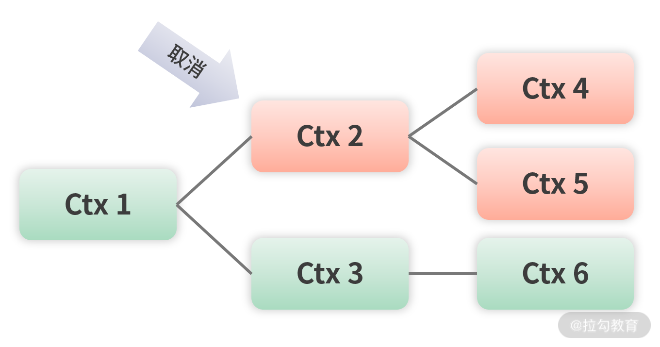 可以看到,当节点 Ctx2 取消时,它的子节点 Ctx4、Ctx5 都会被取消,如果还有子节点的子节点,也会被取消。也就是说根节点为 Ctx2 的所有节点都会被取消,其他节点如 Ctx1、Ctx3 和 Ctx6 则不会。
