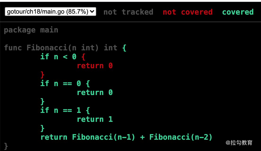 以上示例中的 Fibonacci 函数是否被全面地测试了呢?这就需要用单元测试覆盖率进行检测了。